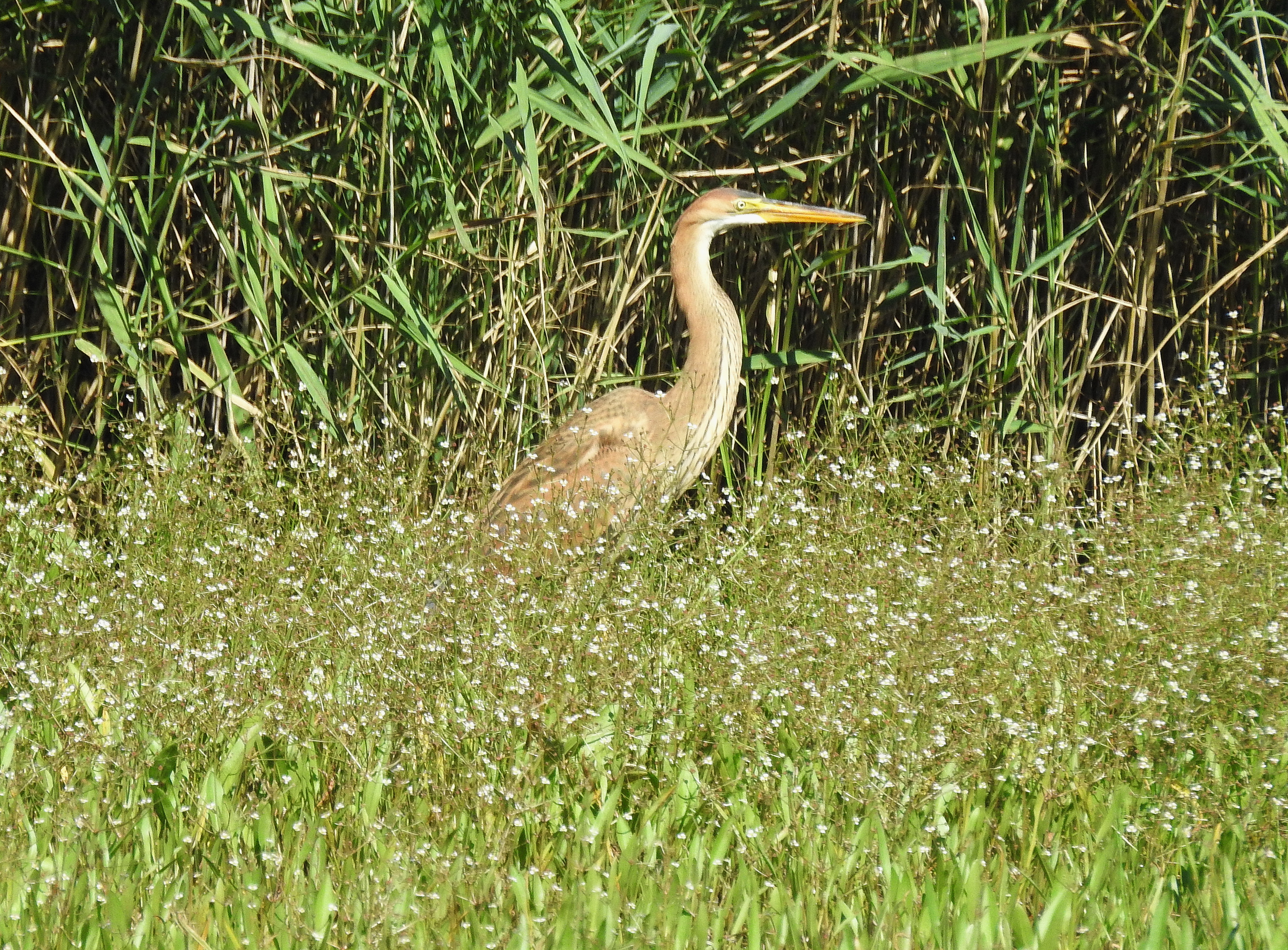 We vervolgen de excursie over de Van Oudheusdenweg naar de parkeerplaats Lisdoddelaantje / Kalmoeslaatje. Maar de parkeerplaats is vol. Er zijn veel fotografen, die de boomvalk die in de elektriciteitsmast voor de parkeerplaats broedt, fotograferen. We rijden door naar de parkeerplaats Willem Alexander Roeibaan aan het einde van de Oudheusdenweg. We maken een wandeling langs de roeibaan. We zien lepelaars met bedelende jongen, kleine zilverreigers, watersnippen en in de verte de witwangstern. Maar de afstand is groot waardoor de waarneming onzeker is. Nu en dan vliegt er een gierzwaluw over. Een van de deelnemers ziet een waterral oversteken van de ene naar de andere strekdam. Vanuit het riet klinkt een kleine karekiet.